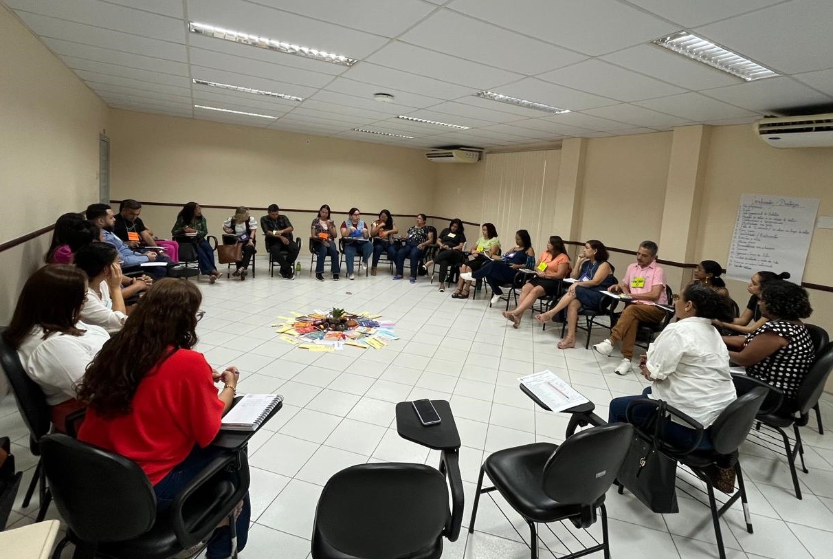 A formação contou com a presença de duas profissionais da área da Justiça Restaurativa, Ceila de Moraes, docente e coordenadora do curso de Licenciatura em Pedagogia pelo Programa Forma Pará da Universidade do Estado do Pará (UEPA), e Josefa Dutra, coordenadora de Justiça Restaurativa do Tribunal de Justiça do Pará (TJPA). Josefa é pedagoga, mestre em Ciências da Sociedade pela UFOPA, especialista em Tecnologias em Educação pela PUCRJ e facilitadora e multiplicadora de círculos de construção de paz e justiça restaurativa, formada por Kay Pranis TDH.
