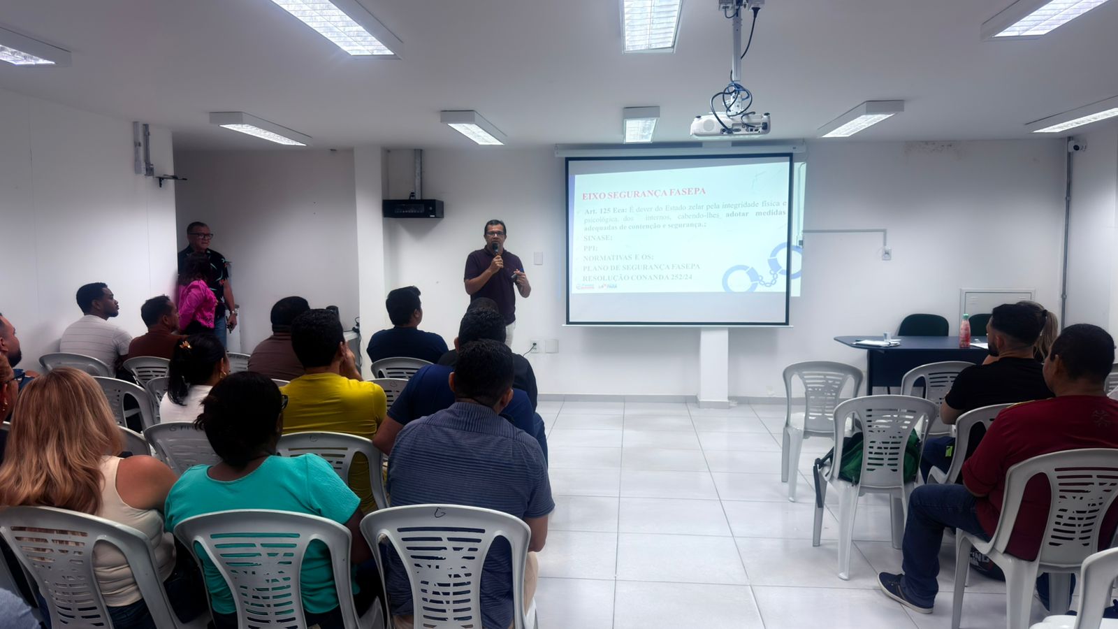 Já no segundo dia de formação (17), as atividades seguiram com explicações sobre o Regime Jurídico Único (RJU) e processo administrativo disciplinar, palestra ministrada pela corregedora da Fasepa, Mylena Andrade, além de orientações sobre comunicação não violenta no ambiente institucional, com a participação da psicóloga, Tereza Caleja, além da palestra sobre segurança preventiva no contexto socioeducativo, com o responsável pelo eixo segurança da Fasepa, Anderson Benevides.